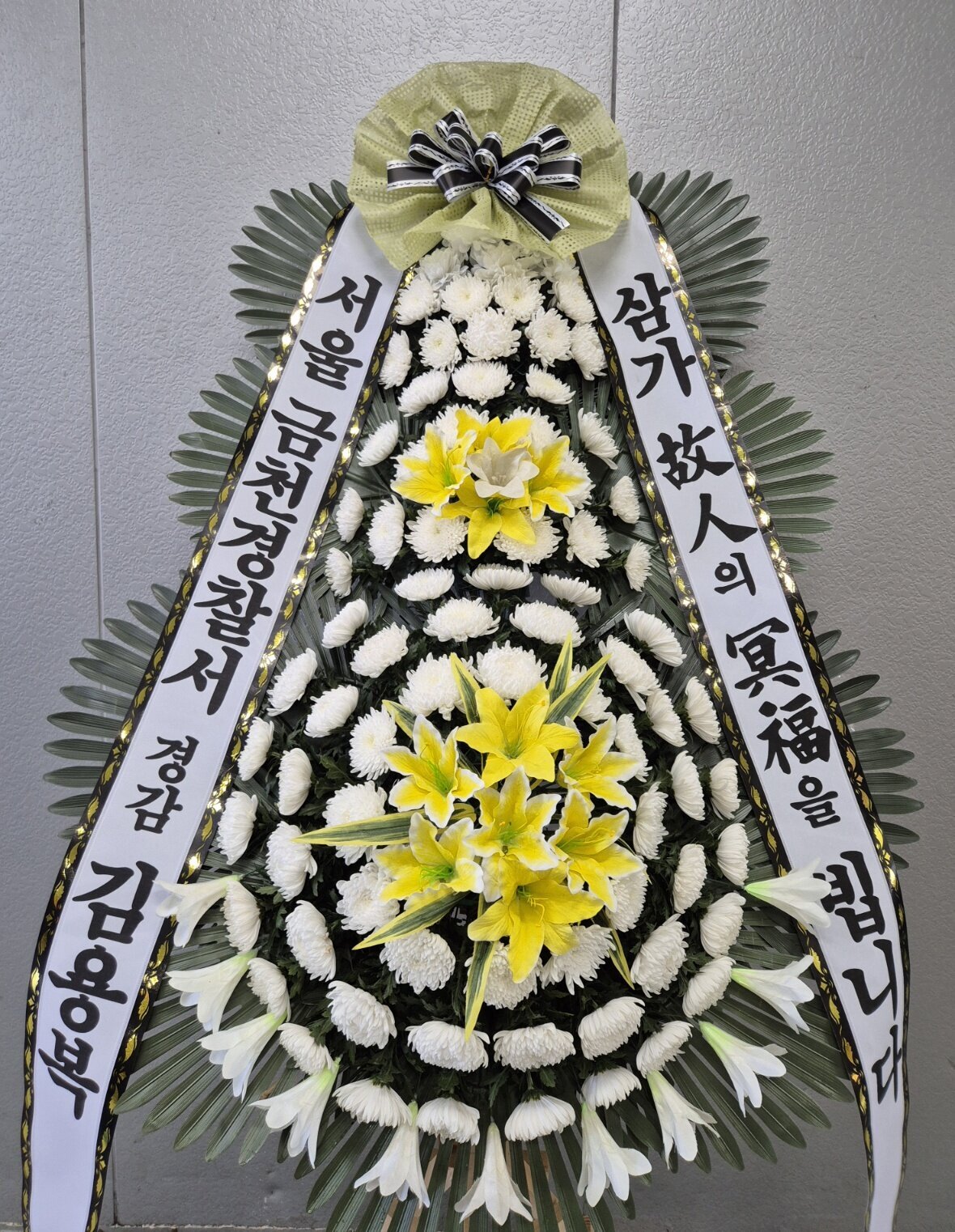 완벽한 대칭을 이루는 큼직큼직한 사이즈의 근조3단화환!